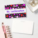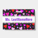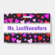 This fun, loving, happy badge design features a pattern of heart shapes of various sizes on a black background. The hearts are coloured various colours, including colours like red, magenta, pink and purple. It also features a personalised name in purple coloured text within a white coloured band. A badge like this could perhaps be worn by a teacher, educator, tutor or professor during the early weeks of a school year or a course. It might help the students learn and remember their teacher’s name. [~Z0000175]