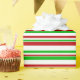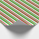 This wrapping paper design features a Christmas and holidays style pattern of stripes having colours like red, white, and green. Wrapping paper like this might be used when preparing gifts being given to celebrate a birthday, a wedding, an anniversary, or some other event.