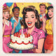 Fun birthday party paper coasters with a group of retro mid-century friends celebrating! These are in pink, yellow, red and blue. The front woman is holding a vintage birthday cake.