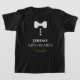 These fun t-shirts are designed as favours or gifts for wedding ring bearers. The t-shirt is black and features an image of a white bow tie and three buttons. The text reads Ring Bearer, and has a place to enter his name as well as the wedding couple's name and wedding date. Great addition to a wedding swag bag.