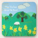 The original and cute illustration on this original and fun coaster is a painting in a "nieve" sort of style, it's bright and colourful. The picture shows some white and fluffy black faced sheep grazing behind daffodils on the hillside as the large sun shines down upon them, the sky is blue with fluffy clouds floating by. In the background you can see small leaf covered trees with red apples on them. This coaster has the fun slogan "May the sun shine on you!" and is suitable for people of all ages.
