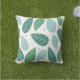 A bright and decorative throw pillow with blue and green leaves. A wide array of other throw pillows and products are available at my store.
