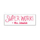 This positive rubber stamp design features the motivating message "SUPER WORK!" and a custom teacher's name. It could be used by a teacher or educator when marking assignments, to acknowledge that a student has done well.