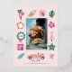 Celebrate the festive holiday season with our fun tropical, festive and colorful holiday photo card. Our festive tropical design features a single photo in the middle of the card to display your own fun family photo. The photo is framed with various tropical Christmas theme illustrations including a pink convertible, palm frond wreath, palm trees with lights, a present, tropical flower bow, etc. with rose gold foil accents. The words fa la la and let's roll are displayed over the pink convertible in pink gold foil. All artwork contained in this girly and fun topical Christmas & Convertable holiday card are hand-drawn original artwork by Moodthology Papery.