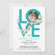 This modern invitation to a Valentine's day party has a large bold turquoise script saying Love, a couple photo inside one of the letters, and some white floral ornaments. The back is turquoise. It can also be customised to use it for a wedding anniversary, for a birthday, for Easter or another festive occasion.