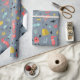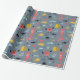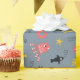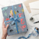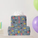 This lovely wrapping paper features a dark grey background with cute cartoon sea creatures including a red seahorse, yellow, black and light blue fishes, a fun red crab, starfish, and some seaweeds.