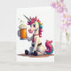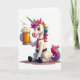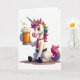 This greeting card shows a creamy white unicorn sitting front and center on a bright white background, with a rainbow mane and tail swirling in fuchsia, goldenrod, and teal 🌈. Its big purple eyes and rosy cheeks lean into a flirty, friendly look, like it’s sharing a private joke with whoever’s holding the card. A red tie hangs neatly at its neck, and a studded belt wraps its middle, adding a cheeky, dressed-up touch. In one hoof it holds an amber-filled mug topped with a thick cap of foam, and a few bubbles rise above it like a tiny toast. The unicorn’s soft pink snout and delicate lashes make the face feel gentle and inviting, as if it’s ready to clink mugs with a close friend 💚. St. Patrick’s Day text sits above the character in green, with a smaller line below in lighter green near the bottom edge. Under the unicorn is an uneven brown patch that looks like a little spill mark against the white space.