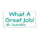 This positive rubber stamp design features the inspirational message "What A Great Job!" and a customised educator's name. It could be used by a teacher or educator when marking assignments, to acknowledge that the student has done well.