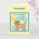 Reach out to a special friend to say "You are the Best" with this whimsy dog greeting card and customisable words that you can change to other messages. The friendship message inside is also customisable for your own words to your friend or friends. This cute grey (grey) dog is ready for fun time at the beach or pool with a colourful beach ball and a turquoise and lavender beach umbrella. Wearing cool yellow sunglasses, fuchsia and turquoise flip flops, orange beach tee shirt and a purple and green large brim hat, she's ready to go, dressed in style for the sun. The background is yellow. The dog with the sun, umbrella and ball is inside the card with a customisable greeting. The dog breed fits with terrior or other small grey dogs with medium to long hair. This design is cute for all dog lovers and is original art by artist and fabric designer Phyllis Dobbs. Fully customisable. Coordinate with stamps, party napkins and other matching items in this store.