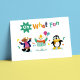 Customise birthday invites for your toddler boy or girl. A handsome moose, kind winter kitten, and playful penguin are dressed for sweater weather in celebration of your boy's or girl's big day, be 1st, 2nd, 3rd, 4th, or 5th birthday. Mint green with fun abstract graphics on back.