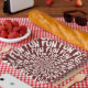 FUN in a fun shaky cream font in a repeating spiral pattern on a burgundy red background. A fun tableware design for your next birthday party or fun get together.