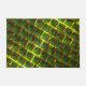 Imagens quadradas verde colocadas como se fossem tijolos em uma parede - inclinada -, onde as linhas amarelas, marrom ou douradas na volta das pequenas imagens podem parecer em alto relevo ou parecer que o fundo é composto com as imagens verdes e, parecendo estarem as pequenas imagens mais profundas que as linhas amarelo dourado, linhas que pode parecer um tipo de grade.