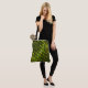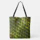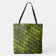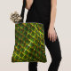 Imagens quadradas verde colocadas como se fossem tijolos em uma parede - inclinada -, onde as linhas amarelas, marrom ou douradas na volta das pequenas imagens podem parecer em alto relevo ou parecer que o fundo é composto com as imagens verdes e, parecendo estarem as pequenas imagens mais profundas que as linhas amarelo dourado, linhas que pode parecer um tipo de grade.