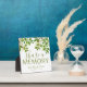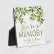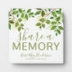 Funeral memory plaque featuring a simple white background, green watercolor foliage, the words "share a memory", your loved ones name, and dates.