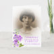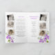 Funeral order of service double-sided floral purple delphinium watercolor art program with purple flowers and green leaves on white. Simply replace the sample text and instant style white framed photo holders and the soft photo frame on the front with your own special photos and information details. Original botanical watercolor delphinium painting and design by Sarah Trett for www.mylittleeden.com (photos are just placeholder images for you to replace with your own).
