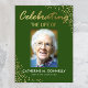 Funeral photo welcome sign featuring a green background that can be changed to any colour, a photo of your loved one, a scattering of gold glitter, their name and dates.