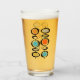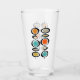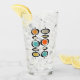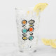 This fabulous mid century modern glass tumbler features two sets of abstract hanging circles in the colours of turquoise blue, two shades of orange, cream, avocado green, gold, and black. This will make a fun addition to your kitchen!