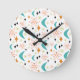 This fabulous mid century pattern wall clock features boomerangs, fireworks, atomic shapes, and diamonds in orange, turquoise blue, olive green, and black. Very funky!