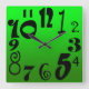 A stylish clock with funky fun black numbers, in different sizes and styles on a simple, modern, gradient of shaded green, background