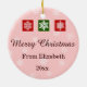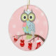 The owl in shades of teal and its body has a pink rose with lime green leaves and white circular pattern in light teal. The wings are in chocolate brown with white pattern. The ornaments are 2 red balls, candy cane, and a red sock on the branch. The background is snowflakes in the pink. The back of ornament is snowflakes in pink and the texts are in chocolate brown and they're customisable. This is a digital illustration.
