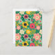 A cute floral pattern of simple colorful flowers and leaves in several colors on a green background.