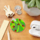 Funky cartoon red ladybugs scuttling around against a retro green swirly background design.