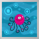 Funky cartoon octopus swimming in the ocean waves with retro air bubbles.