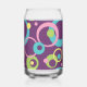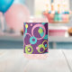 A vibrant purple background is adorned with a funky pattern of circles, dots, and rings in a variety of bright colours, including pink, green, blue, and yellow. This glassware is also available in rocks and stemless wineglass styles.