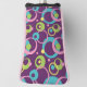 A vibrant purple background is adorned with a funky pattern of circles, dots, and rings in a variety of bright colours, including pink, green, blue, and yellow.
