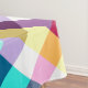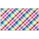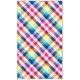 A 60”x104” tablecloth featuring a colourful plaid pattern design in rainbow colours.