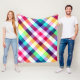A medium sized fleece blanket featuring a colourful plaid pattern design in rainbow colours.