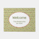 Easily personalise the text on this welcome mat. The design features a retro style pattern in olive green with bead-like oblong shapes set at intervals along straight vertical lines. Each colour may be edited in this special graphic for a custom look.