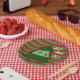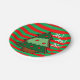 Festive, bold red and green stripey Christmas paper party plates with Christmas tree design.