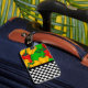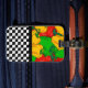Fun and funky luggage tag feature tri coloured bell peppers with black and white chequerboard pattern