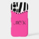 Make a bold statement with this chic iPhone case featuring a striking black-and-white zebra print paired with a vibrant pink lower half. A playful wavy border with black dots separates the two sections, adding a touch of flair. Centered on the pink background is the elegant monogram in a decorative black font, giving the case a personalized and fashionable finish.