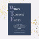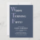 Celebrate your 50th birthday in style and with humour! On a dark blue background, the light purple and white typography at the top reads "Who's Turning Fifty?" with the WTF larger and in purple. Underneath, you can customise the white typography with your own details. Unique, cheeky and perfect for the big birthday celebrations!