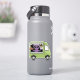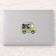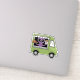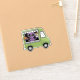 A funny purple alien in a green food truck with a slice of pizza and french fries