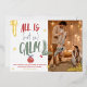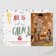 A cool, original and funny Christmas greeting multi colours in green, red and blue, All is not so calm modern script with pine tree branches, snowflakes and christmas ball decoration with real gold foil. Add your family photo and your funny message.