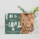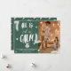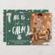 A cool, original and funny Christmas greeting in green, All is not so calm modern script with pine tree branches, snowflakes and christmas ball decoration. Add your family photo and your funny message.