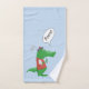 Golfer's sweat hand towel done in light blue with cartoon graphics of a dressed alligator golfing. Black text in the speech bubble reads Fore! and can be personalised to read what you want.
