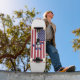 Funny modern proud patriotic American flag design with a fun vintage gothic skull wearing Abraham Lincoln style top hat and a red white and blue stars and stripes american U.S.A. star spangled banner flag , with God bless America text saying. Proudly celebrate United states of america thanksgiving or 4th of july independence day in style.