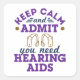 Funny audiology gift for audiologist. Design says, "Keep calm and admit you need hearing aids."