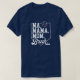 Minimalist baseball mum shirt design featuring the phrase "Ma. Mama. Mum. Bruh." in bold black letters with a small red heart above, combining sporty humour with simple, stylish flair—perfect for game days and proud sports moms. Customisable team name and number are on the back of the t-shirt.