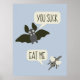 This funny poster is perfect for adding some biology-based humour to your wall. It features a cartoon bat saying "You Suck" to a cartoon mosquito who replies, "Eat Me." Set against a light blue background.
