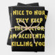 A humourous message emphasizes the importance of being kind to nurses. Bold yellow text stands out against a black background, adding to the playful tone.