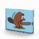 This happy beaver is ready to build his lodge with a chainsaw. Drawn in fun cartoon illustration style!