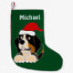 Wonderful funny Bernese Mountain dog Santa hat original art Christmas stocking design. Can also add custom text and change background colour when ordering.