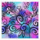 A funny little bird in the upper left corner and floral elements on a pink, purple and turquoise background.