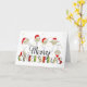 This is a fun Christmas card design featuring six comical little bird characters each wearing a Santa hat. Underneath these cute characters is the hand crafted text 'Merry CHRISTMAS'. Five of the birds are standing/balancing on the word 'Merry', one is asleep on the word 'CHRISTMAS'.