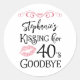 Funny Birthday Kissing A Decade Goodbye Custom Party Stickers. Celebrate a birthday beginning a new decade with these funny party stickers featuring an editable age modern typography design for the saying NAME'S KISSING HER "DECADE" GOODBYE (the sample shows 40s for a 50th birthday). CHANGES: The personalised text font style, colour, size and placement as well as the graphics and background colours can be changed to coordinate with your party theme colours (shown in pink and black). ASSISTANCE: For help with design modification or personalisation, colour change, resizing, transferring the design to another product or you would like coordinating items, contact the designer BEFORE ORDERING via Zazzle Chat or makeitaboutyoustore@gmail.com.